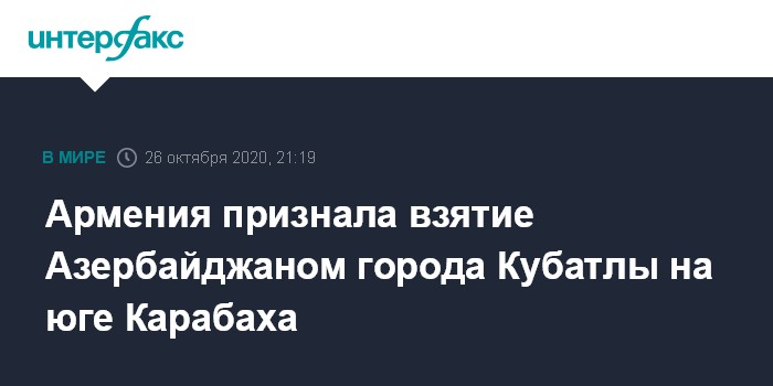Москва. 26 октября. INTERFAX.RU - Вооруженные силы Азербайджана заняли город Кубатлы в непризнанном Карабахе, сообщил представитель Минобороны Армении Арцрун Ованнисян.