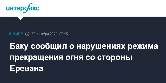 "В течение дня 26 октября и в ночь на 27 октября армянские вооруженные силы, не соблюдавшие новый режим гуманитарного прекращения огня, подвергли обстрелу из различных видов оружия позиции подразделений армии Азербайджана на разных направлениях фронта и населенные пункты вблизи прифронтовой зоны", - говорится в сообщении.