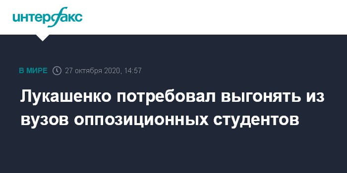 Москва. 27 октября. INTERFAX.RU - Президент Белоруссии Александр Лукашенко предложил отчислять из вузов студентов, участвующих в несанкционированных акциях протеста.