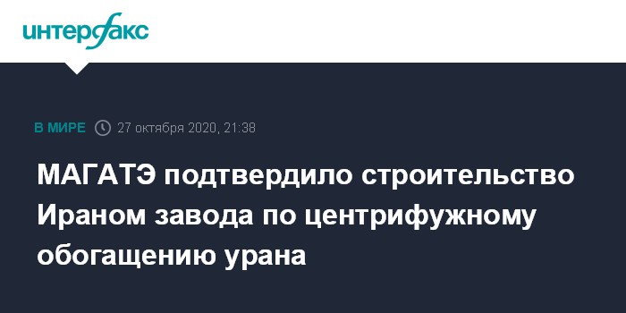 Москва. 27 октября. INTERFAX.RU - Инспекторы Международного агентства по атомной энергии (МАГАТЭ) получили подтверждения появившейся ранее информации, что Иран приступил к строительству подземного предприятия по сбору центрифуг для обогащения урана. Об этом заявил во вторник в интервью агентству Associated Press (AP) гендиректор МАГАТЭ Рафаэль Гросси.