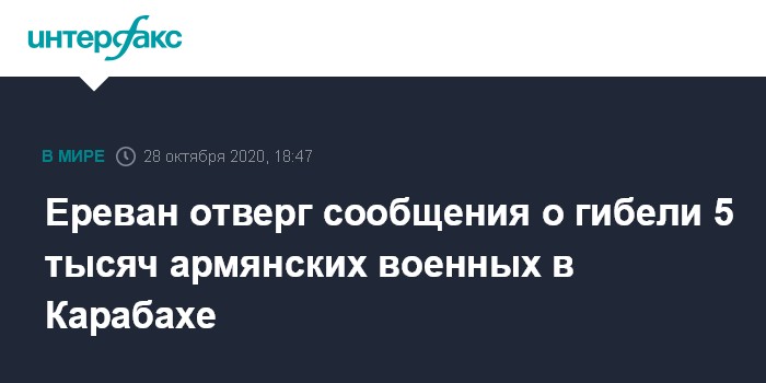 Москва. 28 октября. INTERFAX.RU - В Ереване опровергли заявление президента Азербайджана Ильхама Алиева о потерях армянской стороны в ходе боев в Нагорном Карабахе.