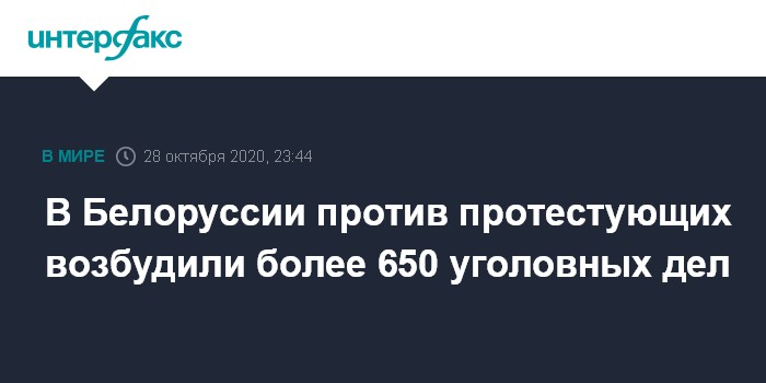 Москва. 28 октября. INTERFAX.RU - Более 650 уголовных дел возбуждено в Белоруссии в связи с протестами, сообщил в эфире телеканала "Беларусь 1" генеральный прокурор страны Андрей Швед.