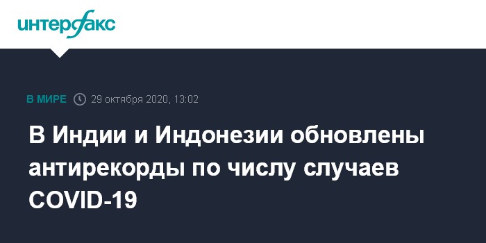 Москва. 29 октября. INTERFAX.RU - Индия и Индонезия установили новые антирекорды по числу заражений коронавирусом, Пакистан ввел ограничения в 11 городах, а на Тайване не было ни одного местного случая заражения уже 200 дней, сообщают зарубежные СМИ.