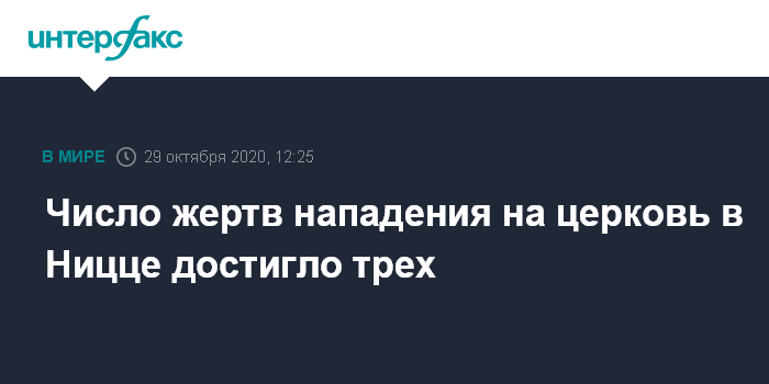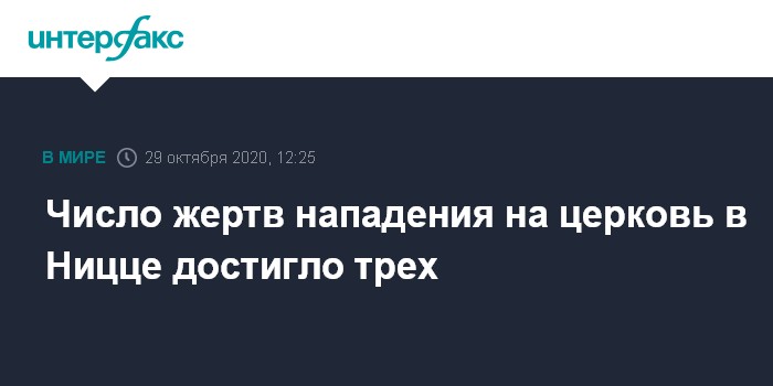 Москва. 29 октября. INTERFAX.RU - Три человека погибли в результате нападения на городскую церковь Нотр-Дам в Ницце, сообщает телеканал BFMTV.