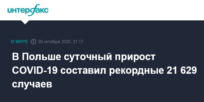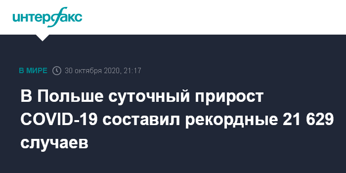 Москва. 30 октября. INTERFAX.RU - В Польше за минувшие сутки выявлены 21 629 новых случаев заражения коронавирусом, сообщает агентство РАР со ссылкой на данные Минздрава. Это рекордный суточный прирост заболеваемости с начала пандемии.