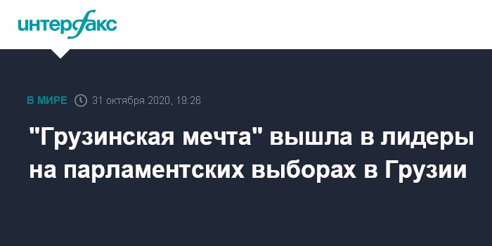 Москва. 31 октября. INTERFAX.RU - Правящая партия "Грузинская мечта" в ходе прошедших в субботу в Грузии парламентских выборов, по данным на 18:00 по тбилисскому времени (17:00 по Москве), набрала 55% голосов избирателей, говорится в опубликованных телекомпанией "Имеди" результатах экзит-пола, проведенного американской организацией по исследованию общественного мнения Public Opinion Strategies.