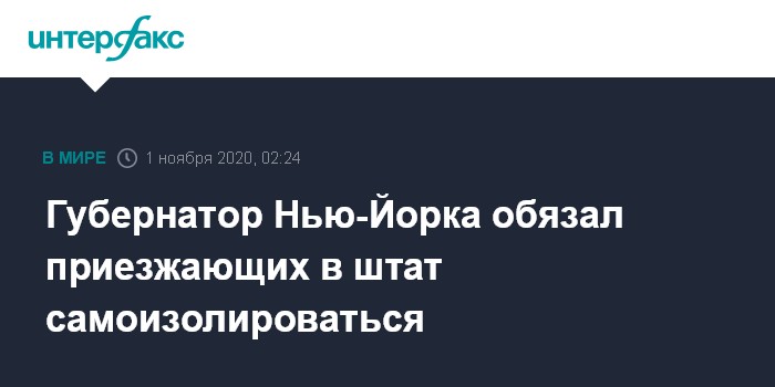 Москва. 1 ноября. INTERFAX.RU - Губернатор Нью-Йорка Эндрю Куомо обязал всех прибывающих в штат самоизлироваться минимум на три дня, а также пройти тест на коронавирус COVID-19. Об этом сообщается на сайте правительства штата Нью-Йорк.