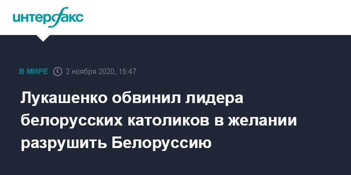 Москва. 2 ноября. INTERFAX.RU - Президент Белоруссии Александр Лукашенко напомнил, что лидеру белорусских католиков, архиепископу Тадеушу Кондрусевичу отказали в разрешении вернуться в Белоруссию, поскольку он "ездил в Польшу и получал консультации, как разрушать страну".