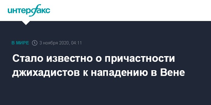 Москва. 3 ноября. INTERFAX.RU - Портал SITE Intelligence Group, отслеживающий деятельность террористов в интернете, заявил о причастности джихадистов к террористическим атакам в Вене.