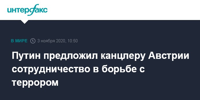 Москва. 3 ноября. INTERFAX.RU - Президент Владимир Путин выразил соболезнования президенту Австрии Александру Ван дер Беллену и федеральному канцлеру Себастьяну Курцу в связи с терактами в Вене. Он выразил готовность наращивать сотрудничество с Веной и другими странами в борьбе со всеми формами терроризма, сообщила пресс-служба Кремля.