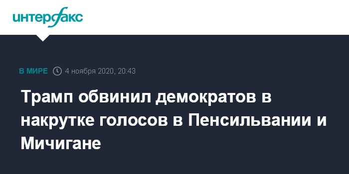 Москва. 4 ноября. INTERFAX.RU - Президент США Дональд Трамп обвинил демократов в попытках манипуляции с голосами сразу в целом ряде штатов.