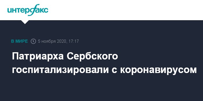 Москва. 5 ноября. INTERFAX.RU - Патриарха Сербского Иринея госпитализировали после положительного теста на коронавирус COVID-19, говорится в заявлении, размещенном на сайте Сербской православной церкви.