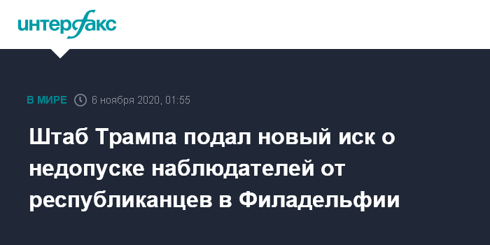 Москва. 6 ноября. INTERFAX.RU - Предвыборный штаб Дональда Трампа подал новый иск против представителей избирательной комиссии Филадельфии (штат Пенсильвания) в связи с тем, что они не допускают наблюдателей от республиканцев следить за подсчетами бюллетеней.