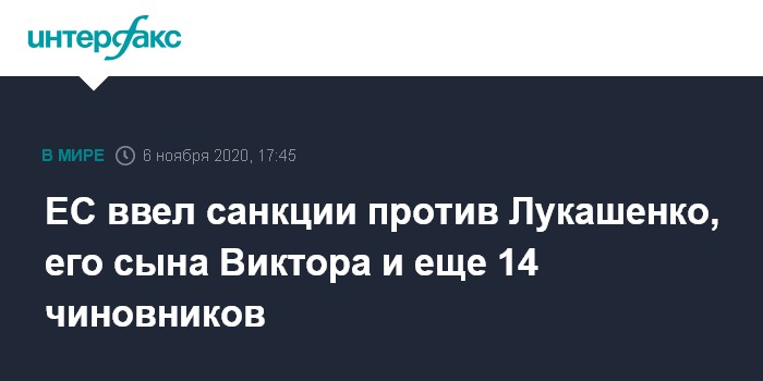 Москва. 6 ноября. INTERFAX.RU - Совет ЕС своим решением в пятницу утвердил дополнительный санкционный список по Белоруссии, в который включены 15 должностных лиц страны, в том числе президент Александр Лукашенко, а также его старший сын Виктор.