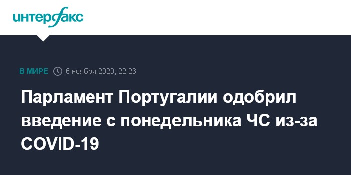 Москва. 6 ноября. INTERFAX.RU - Парламент Португалии в пятницу одобрил возвращение режима ЧС, который при необходимости позволит властям быстро ввести ограничительные меры для борьбы с распространением коронавируса COVID-19, сообщает португальская телерадиокомпания RTP.