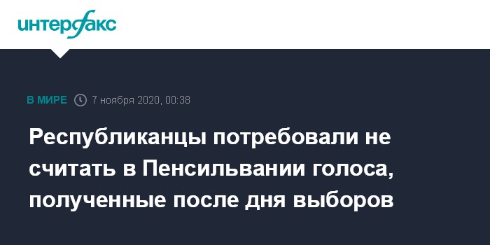 Москва. 7 ноября. INTERFAX.RU - Республиканцы обратились в Верховный суд США с требованием не предпринимать штату Пенсильвания никаких действий в отношении бюллетеней, полученных по почте после дня выборов, 3 ноября, говорится в поданном иске.
