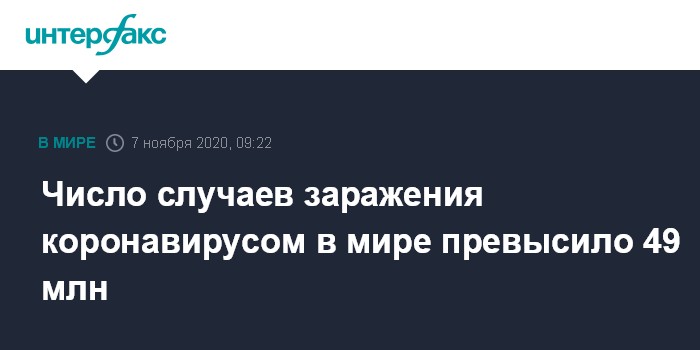 Москва. 7 ноября. INTERFAX.RU - Число выявленных случаев заражения коронавирусом в мире с начала пандемии достигло 49 млн 322 тыс. 827, свидетельствуют данные американского университета Джонса Хопкинса.