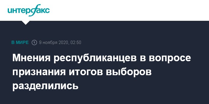 Москва. 9 ноября. INTERFAX.RU - Члены Республиканской партии США разделились на тех, кто признал победу кандидата от демократов Джо Байдена, и тех, кто поддерживает действующего президента Дональда Трампа в его стремлении продолжить борьбу за победу на выборах в суде.