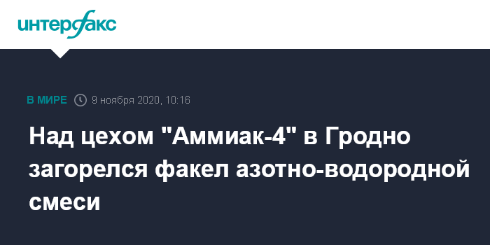 "В 5:30 из-за проблем в технологическом процессе отделения очистки конвертированного газа произошла остановка компрессора синтез-газа со сбросом АВС (азотно-водородной смеси) на факел", - сообщает корпоративное издание "Гродненский химик".