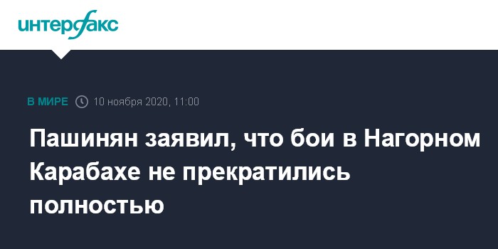 Москва. 10 ноября. INTERFAX.RU - Боевые действия в зоне карабахского конфликта не прекратились полностью, несмотря на трехстороннее заявление России, Азербайджана и Армении о прекращении огня с 00:00 10 ноября по московскому времени, сообщил во вторник глава армянского правительства Никол Пашинян.