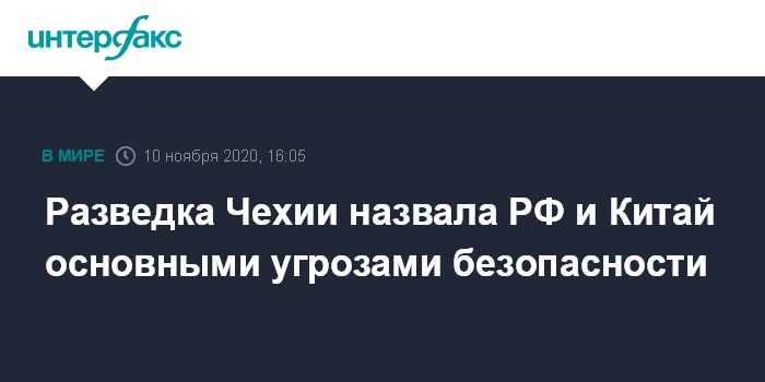 Москва. 10 ноября. INTERFAX.RU - Чешская служба информации и безопасности (BIS) считает, что Россия и Китай представляли в 2019 году основную угрозу безопасности и интересам Чехии, сообщает в своем докладе ведомство.