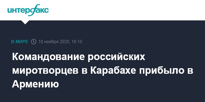 Москва. 10 ноября. INTERFAX.RU - Командование российского миротворческого контингента, который будет нести службу в Нагорном Карабахе, прибыло в Армению, сообщили в Минобороны РФ.