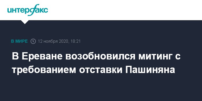 Москва. 12 ноября. INTERFAX.RU - Митинг с требованием отставки премьер-министра Армении Никола Пашиняна возобновился после шествия на площади Свободы в центре Еревана.