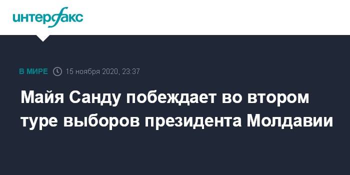 Москва. 15 ноября. INTERFAX.RU - Лидер оппозиции, бывший премьер-министр Молдавии Майя Санду одерживает победу над действующим президентом Игорем Додоном во втором туре выборов президента Молдавии по итогам обработки протоколов с 75% избирательных участков внутри страны.