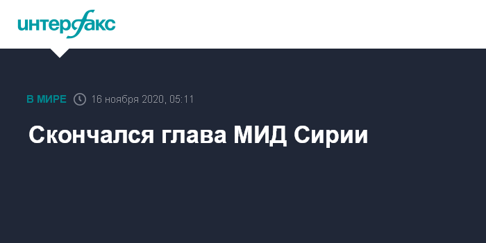 Москва. 16 ноября. INTERFAX.RU - Министр иностранных дел и экспатриантов Сирии Валид Муаллем скончался в возрасте 79 лет в ночь понедельник, сообщает государственное сирийское информагентство SANA.