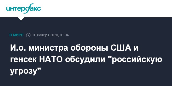 Москва. 16 ноября. INTERFAX.RU - Исполняющий обязанности министра обороны США Кристофер Миллер, который занял этот пост после отставки Марка Эспера, обсудил с генеральным секретарем НАТО Йенсом Столтенбергом проблему угрозы, "исходящей от России", сообщил Пентагон.