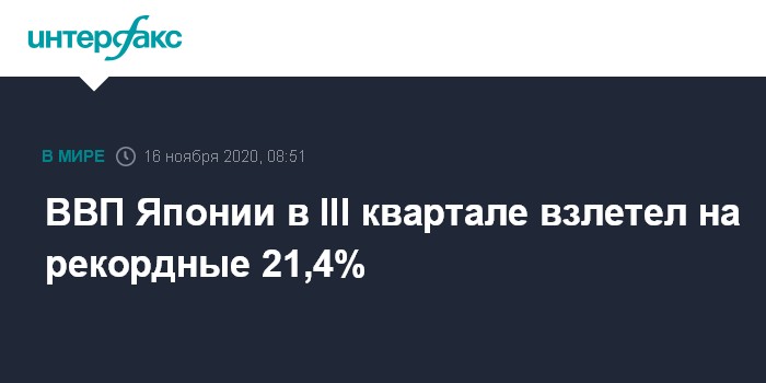 Москва. 16 ноября. INTERFAX.RU - В III квартале 2020 года ВВП Японии вырос на рекордные 21,4% в годовом выражении после самого значительного спада в истории на 28,1% в апреле-июне, свидетельствуют предварительные официальные данные.