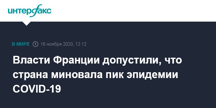 Москва. 16 ноября. INTERFAX.RU - Франция, скорее всего, миновала пик эпидемии коронавируса COVID-19 благодаря введенным ранее ограничительным мерам, заявил глава французского Минздрава Оливье Веран.