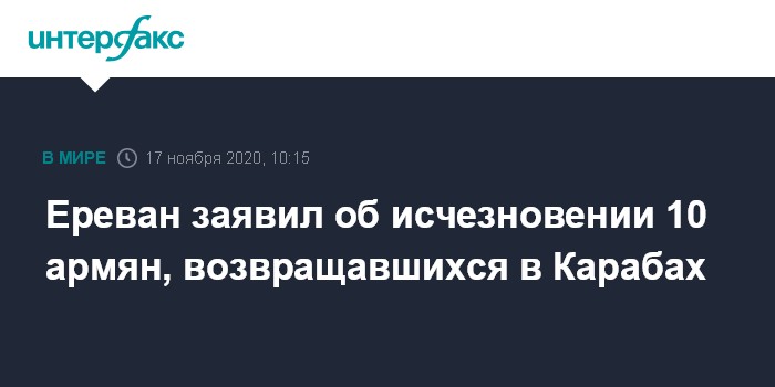 Москва. 17 ноября. INTERFAX.RU - Пропали без вести 10 армян, которые возвращались из города Горис на юге Армении в Нагорный Карабах после объявления о прекращении огня в зоне карабахского конфликта, сообщает представительство Армении в Европейском суде по правам человека (ЕСПЧ).