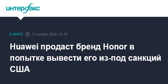 Москва. 17 ноября. INTERFAX.RU - Китайская Huawei Technologies Co. продает подразделение, выпускающее потребительские устройства под брендом Honor, компании Shenzhen Zhixin New Information Technology Co.