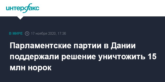 Москва. 17 ноября. INTERFAX.RU - Правительство Дании сообщило, что заручилось поддержкой большинства в парламенте в планах ликвидировать от 15 млн норок на фермах, чтобы избежать заражения людей мутировавшим коронавирусом. Об этом сообщает АР. Голосование по этому вопросу еще не проводили.