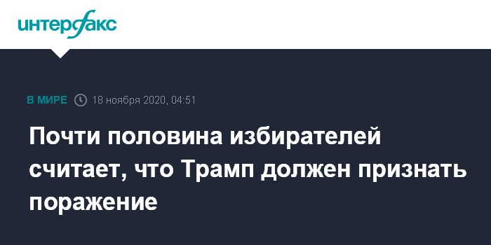 Москва. 18 ноября. INTERFAX.RU - 46% избирателей заявляют, что президент США Дональд Трамп должен немедленно признать свое поражение на выборах 2020 года, свидетельствуют данные опроса, проведенного газетой Politico и компанией Morning Consult.
