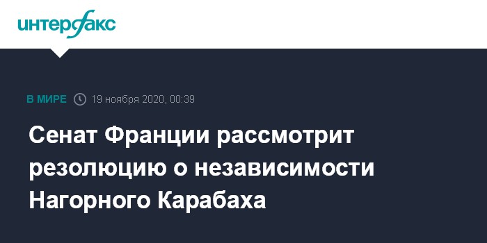 Москва. 19 ноября. INTERFAX.RU - Сенат Франции 25 ноября рассмотрит проект резолюции, призывающей Париж признать независимость Нагорного Карабаха, сообщил сенатор Брюно Ретайо.