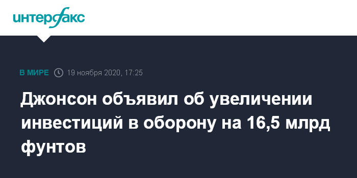 Москва. 19 ноября. INTERFAX.RU - Премьер-министр Великобритании Борис Джонсон в четверг объявил о крупных дополнительных вложениях в сферу обороны.