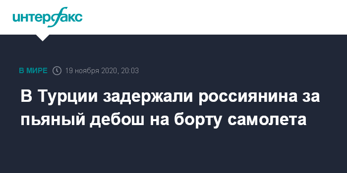Москва. 19 ноября. INTERFAX.RU - Пьяный российский турист избил жену и устроил дебош на борту самолета Петербург-Анталия, сообщили "Интерфаксу" в полиции аэропорта.