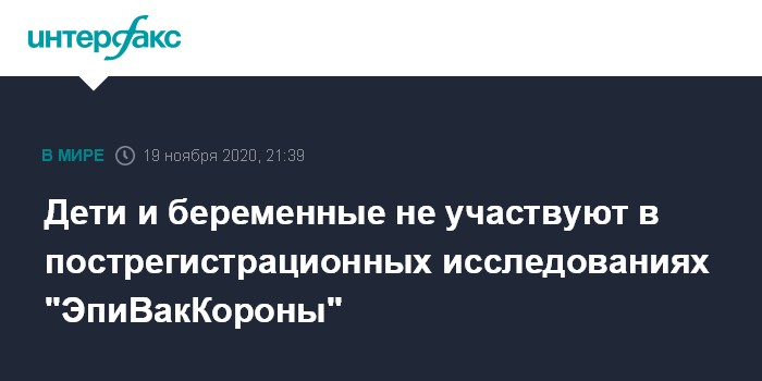 Москва. 19 ноября. INTERFAX.RU - Беременные женщины и дети пока не смогут принять участие в пострегистрационных исследованиях вакцины от коронавируса, разработанной научным центром "Вектор", но для них также разрабатываются средства защиты от COVID-19.
