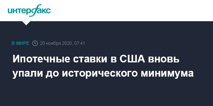 Москва. 20 ноября. INTERFAX.RU - Стоимость ипотечного кредитования в США в тринадцатый раз с начала текущего года опустилась до исторического минимума, при этом она остается ниже 3% годовых семнадцать недель подряд.