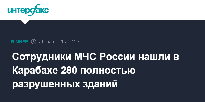 Москва. 20 ноября. INTERFAX.RU - Специалисты российского МЧС пока нашли в Нагорном Карабахе более 280 полностью уничтоженных зданий. Об этом сообщил руководитель оперативной группы ведомства в регионе Игорь Кутровский.