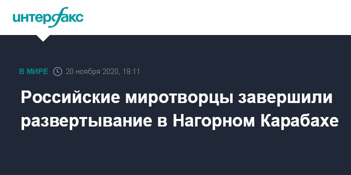 Москва. 20 ноября. INTERFAX.RU - Министр обороны РФ Сергей Шойгу сообщил, что российский миротворческий контингент завершил развертывание на территории Нагорного Карабаха и приступил к выполнению поставленных задач.
