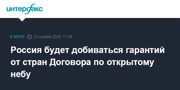Москва. 22 ноября. INTERFAX.RU - Россия намерена добиваться от государств-участников Договора по открытому небу (ДОН) гарантий того, что они будут выполнять предусмотренные документом обязательства, говорится в распространенном в воскресенье заявлении МИД РФ в связи с выходом США из договора.