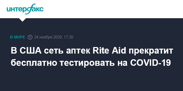 Москва. 24 ноября. INTERFAX.RU - Американская сеть аптек Rite Aid Corp сообщила, что с 1 декабря начнет брать $115 за проведение теста на COVID-19.