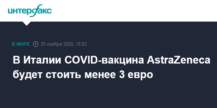 Москва. 25 ноября. INTERFAX.RU - Итальянцы смогут купить дозу вакцины от коронавируса COVID-19 от AstraZeneca менее чем за три евро, заявил глава итальянского подразделения компании Лоренцо Виттум.