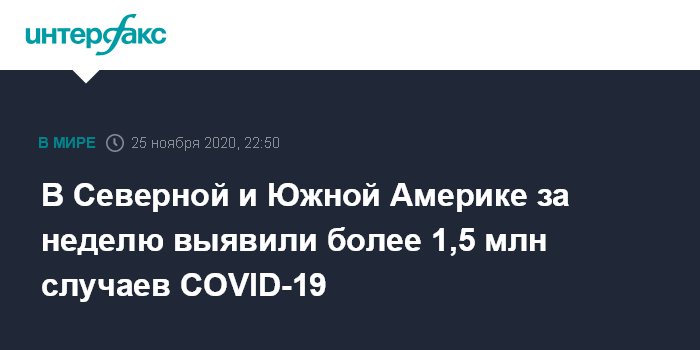Москва. 25 ноября. INTERFAX.RU - В Северной и Южной Америке за последние семь дней выявлены еще более 1,5 млн случаев коронавируса COVID-19, что является рекордным показателем, сообщает в среду издание The Guardian со ссылкой на данные Панамериканской организации здравоохранения (ПАОЗ) - отделения Всемирной организации здравоохранения (ВОЗ).