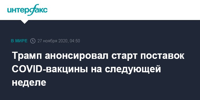 Москва. 27 ноября. INTERFAX.RU - Поставки вакцины от коронавируса в США начнутся на следующей неделе или неделей позже, заявил президент США Дональд Трамп.