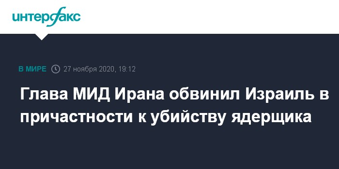 Москва. 27 ноября. INTERFAX.RU - Обстоятельства гибели иранского ученого-ядерщика Мохсена Фахризаде дают повод полагать, что в его убийстве замешан Израиль, заявил глава МИД Ирана Джавад Зариф.