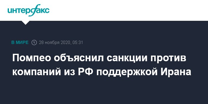 Москва. 28 ноября. INTERFAX.RU - США ввели санкции против двух российских и двух китайских компаний за поддержу ракетной программы Ирана, заявил госсекретарь Майк Помпео.